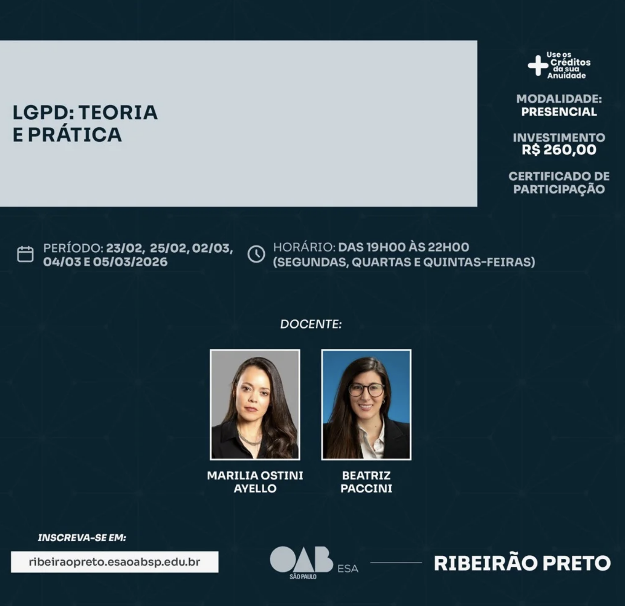 Inscrições pelo link: https://ribeiraopreto.esaoabsp.edu.br/Curso/13052-lgpd-teoria-e-pratica/13052