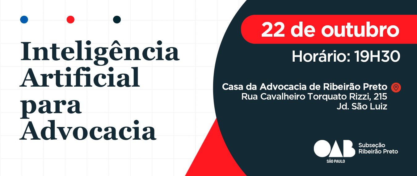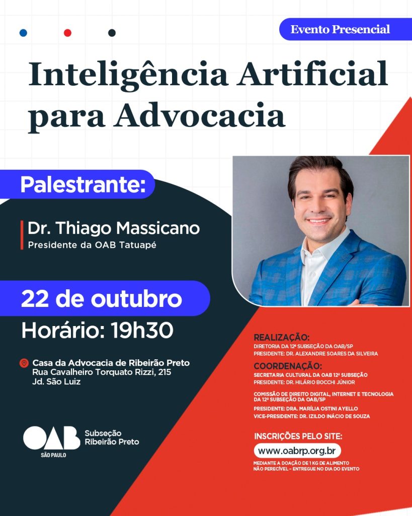Presencial – Inteligência Artificial para Advocacia + Adicionar ao Calendário do Google + Exportar para iCal 00 dias 00 horas 00 minutos 00 segundos Inscrição Data: 22/10/25 Inscrição Solidária 1 kg de alimento não perecível No dia do evento Quantidade de Bilhetes Disponíveis: 150 The Inscrição Solidária ticket is sold out. You can try another ticket or another date. Próximo Data 22/10/2025 Hora 19:30 Valor da Inscrição Inscrição Solidária Localização Casa da Advocacia de Ribeirão Preto Rua Cavalheiro Torquato Rizzi, 215 - Jd. São Luiz INSCREVER-SE Compartilhar Este Evento