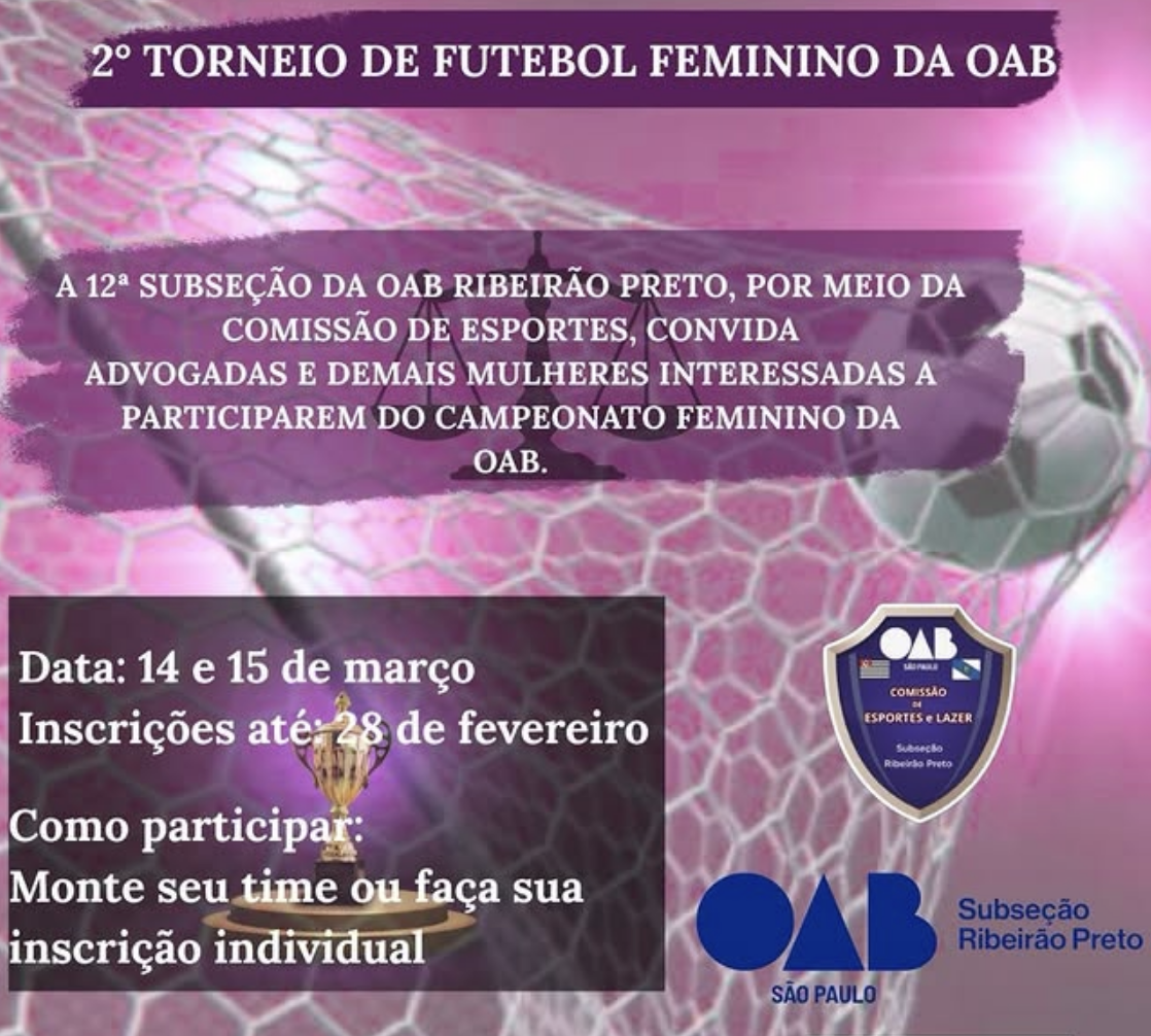 A 12ª Subseção da OAB Ribeirão Preto, por meio da Comissão de Esportes, convida advogadas e demais mulheres interessadas a participarem do Campeonato Feminino da OAB.