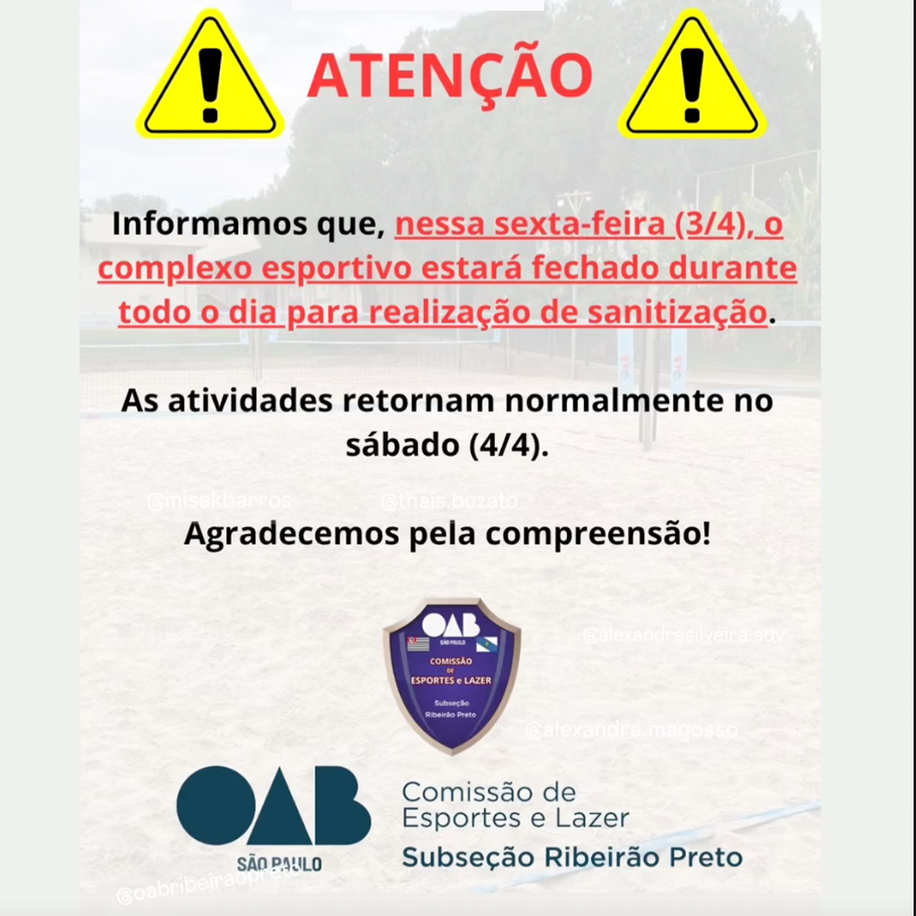 Informamos que, nessa sexta-feira (3/4), o complexo esportivo estará fechado durante todo o dia para realização de sanitização.