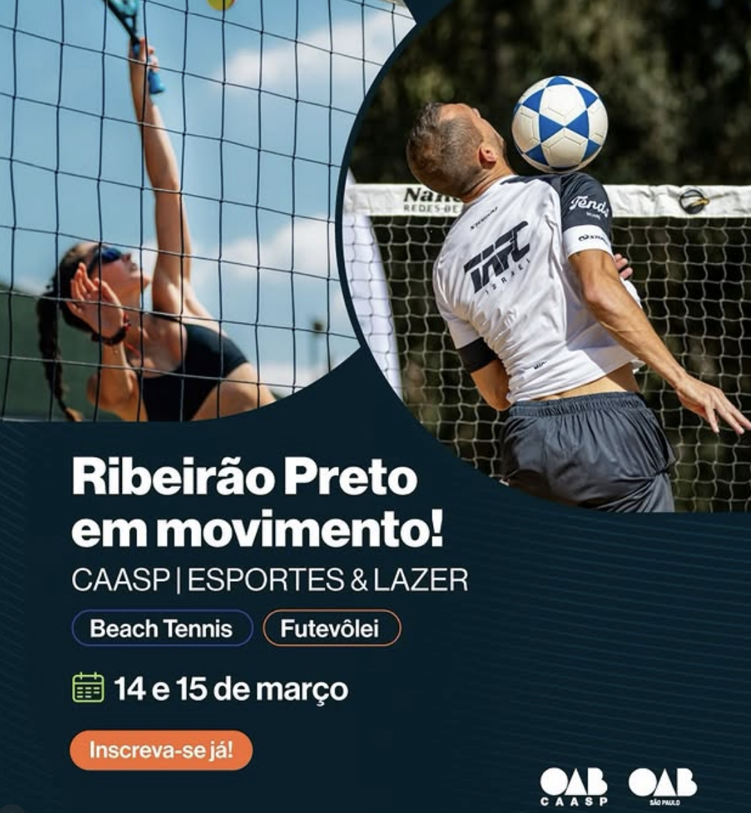 Voltar para NotíciasInscrições Abertas BEACHTENIS / FUTEVÔLEI📅12 de fevereiro de 2026✍️OAB RP Ribeirão Preto em Movimento CAASP I Esportes & Lazer 14 e 15 Março Increva-se já! INSCRIÇÕES BEACH INSCRIÇÕES FUTEVÔLEI